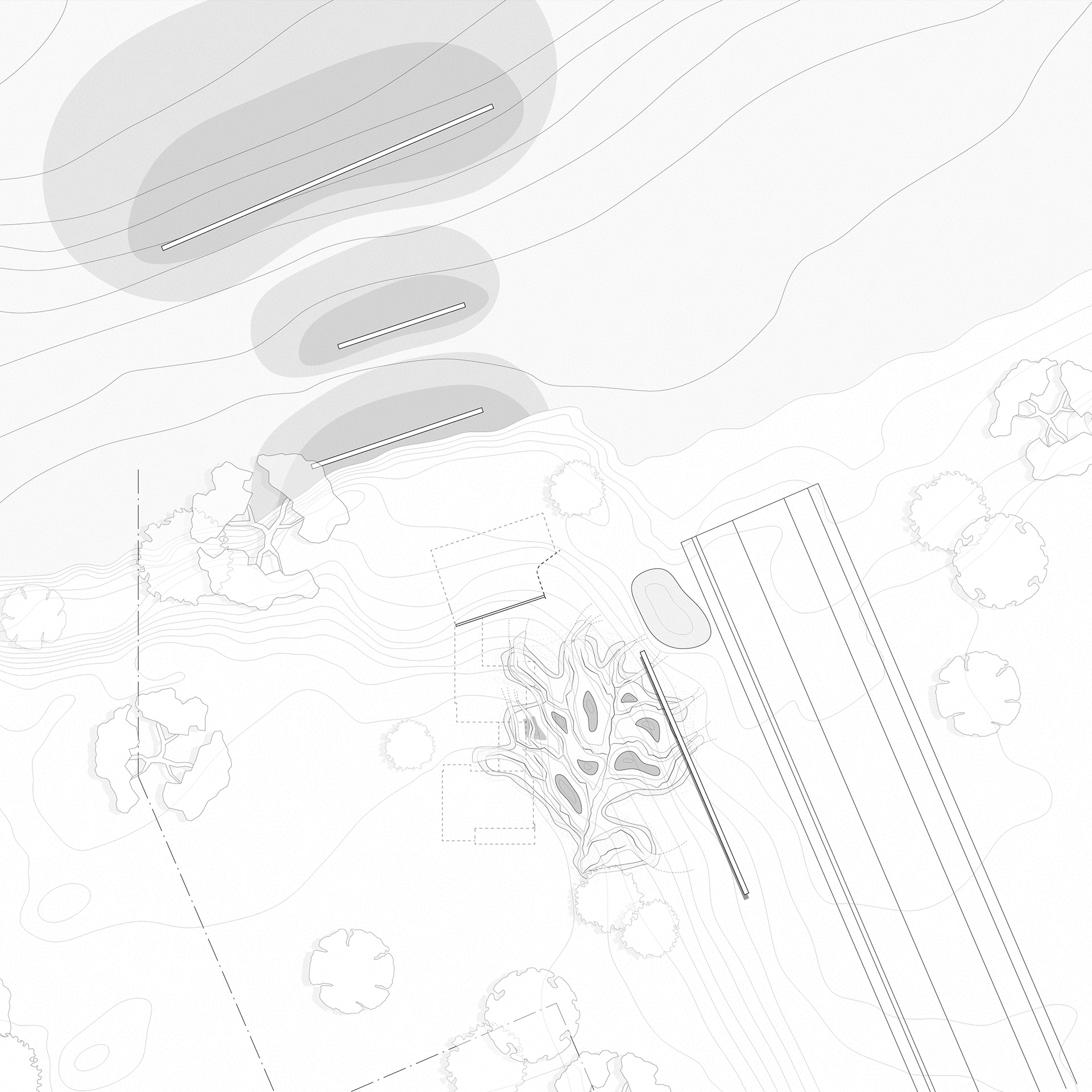 Natural Treatment // Shaded gray area represents placement of rain gardens to stop on-shore soil erosion, light gray oval shape is a basin for runoff